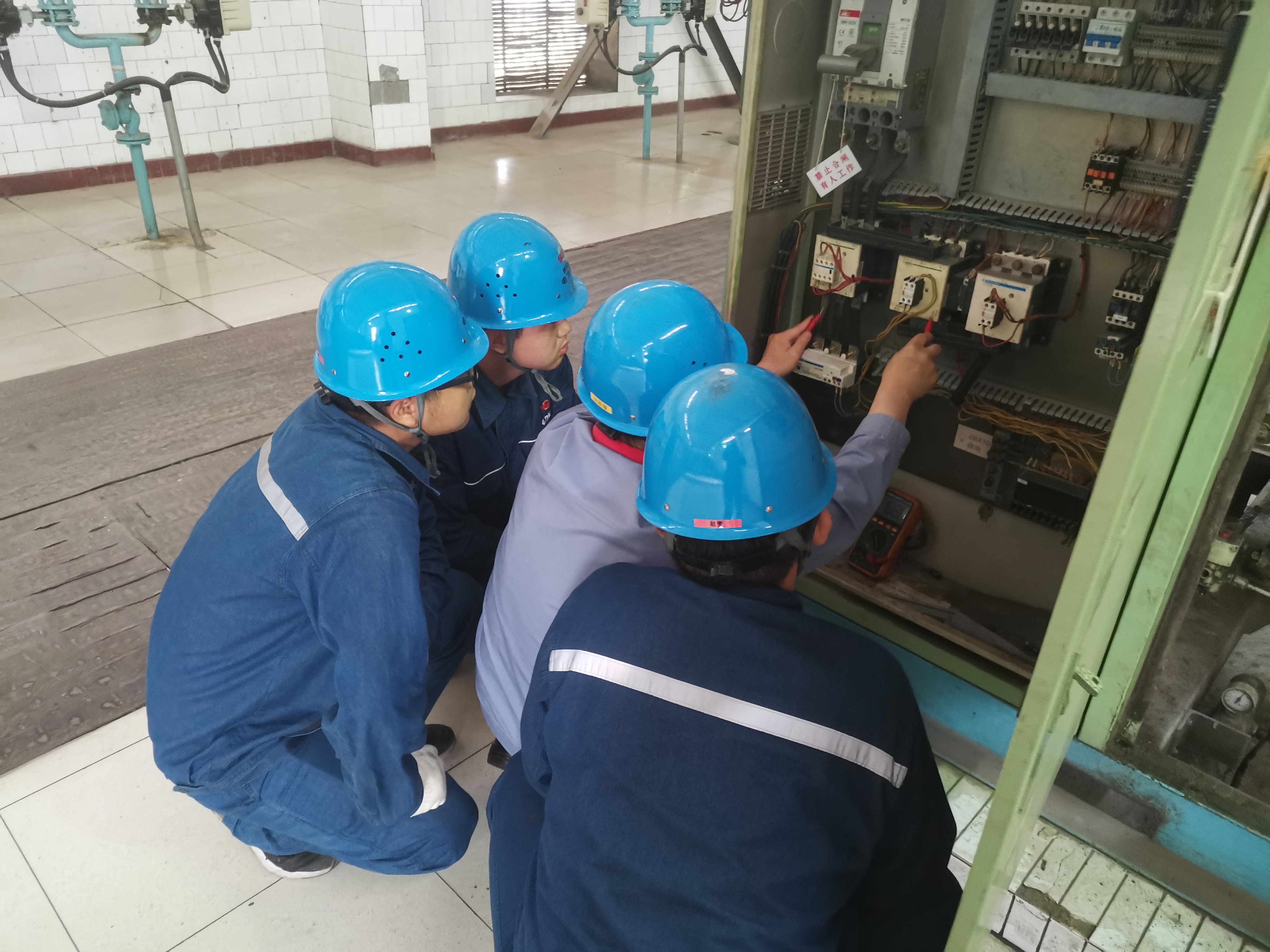培訓課上,控制班班長劉軍耀對空壓機二次回路進行了講解,以提問的方式詳細闡述了電機星型三角型電路的原理和啟動過程及電機反轉時的處理方法。在檢修現場,劉軍耀帶領學員認識了專用的電機更換工具和使用方法,在更換空壓機時讓學員摸索怎樣獨立接線該,如何保證安全且正確的接線,在聽取了學員的回答后一一給出了解決方案。