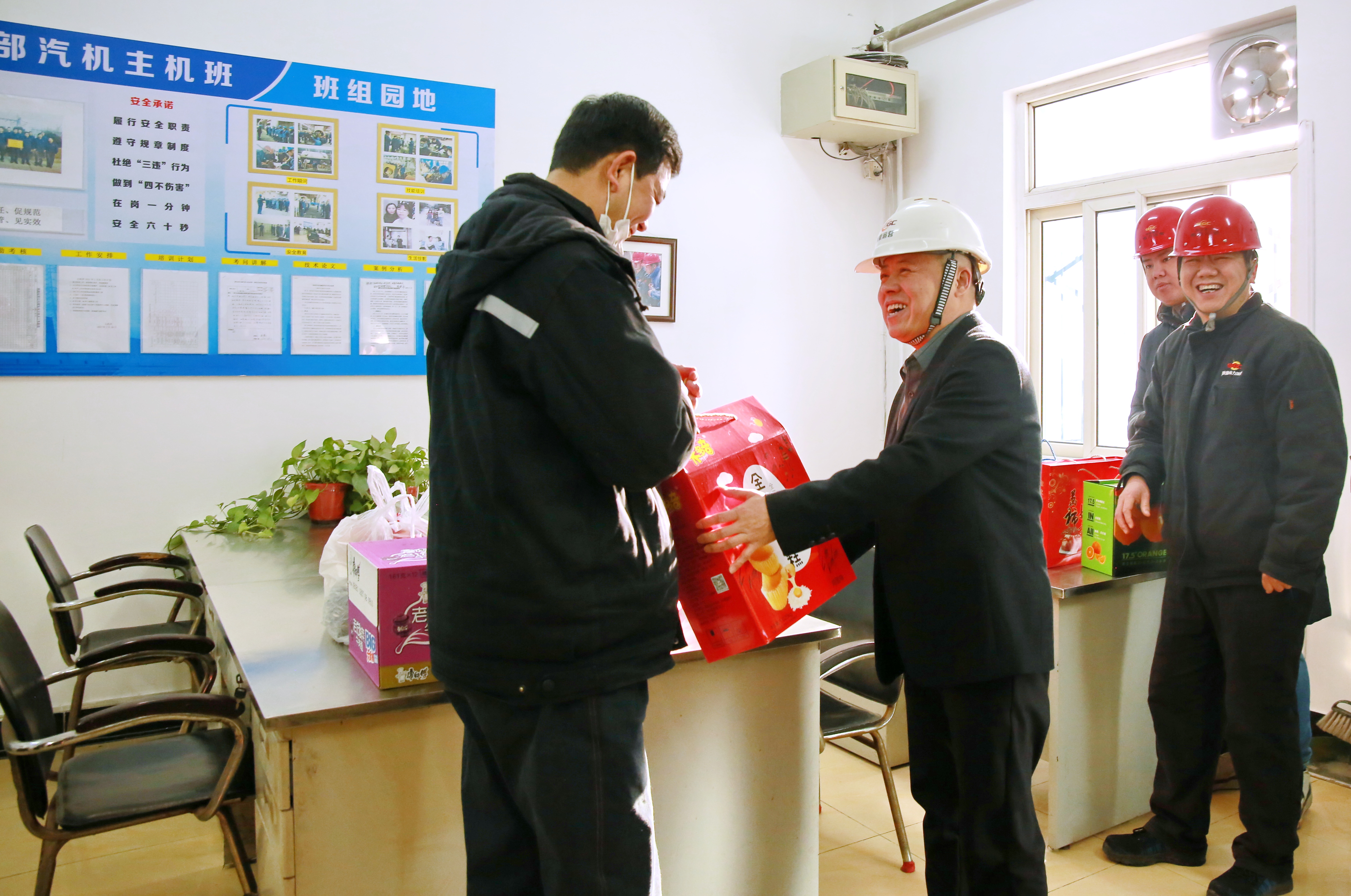 在熱控三班、汽機主機班班組,張小鋒、武紅幸與值守干部職工進行了座談交流,希望大家在2022年再接再厲,為公司高質量發展貢獻新的更大力量。同時,要求項目部時刻緊繃安全生產這根弦,做好節日期間安全生產和后勤保障工作,讓大家感受溫暖、安心工作。