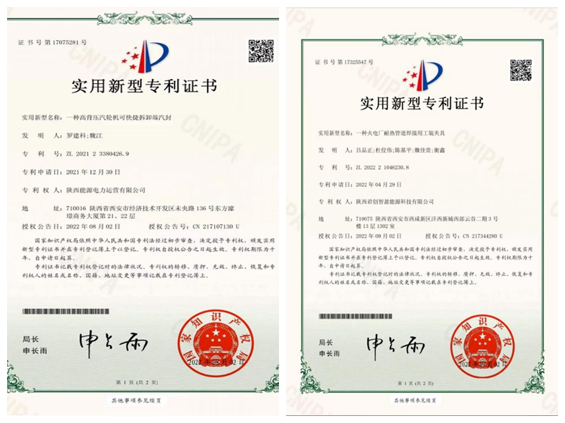 日前,公司“一種火電廠耐熱管道焊接用工裝夾具”、君創科技“一種高背壓汽輪機可快捷拆卸端汽封”獲得國家實用新型專利授權。截止目前,公司共獲取22項國家實用新型專利授權,并在實際工作中陸續推廣。