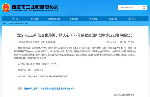 近日,公司成功入選“2022年陜西省創新型中小企業”名單。
