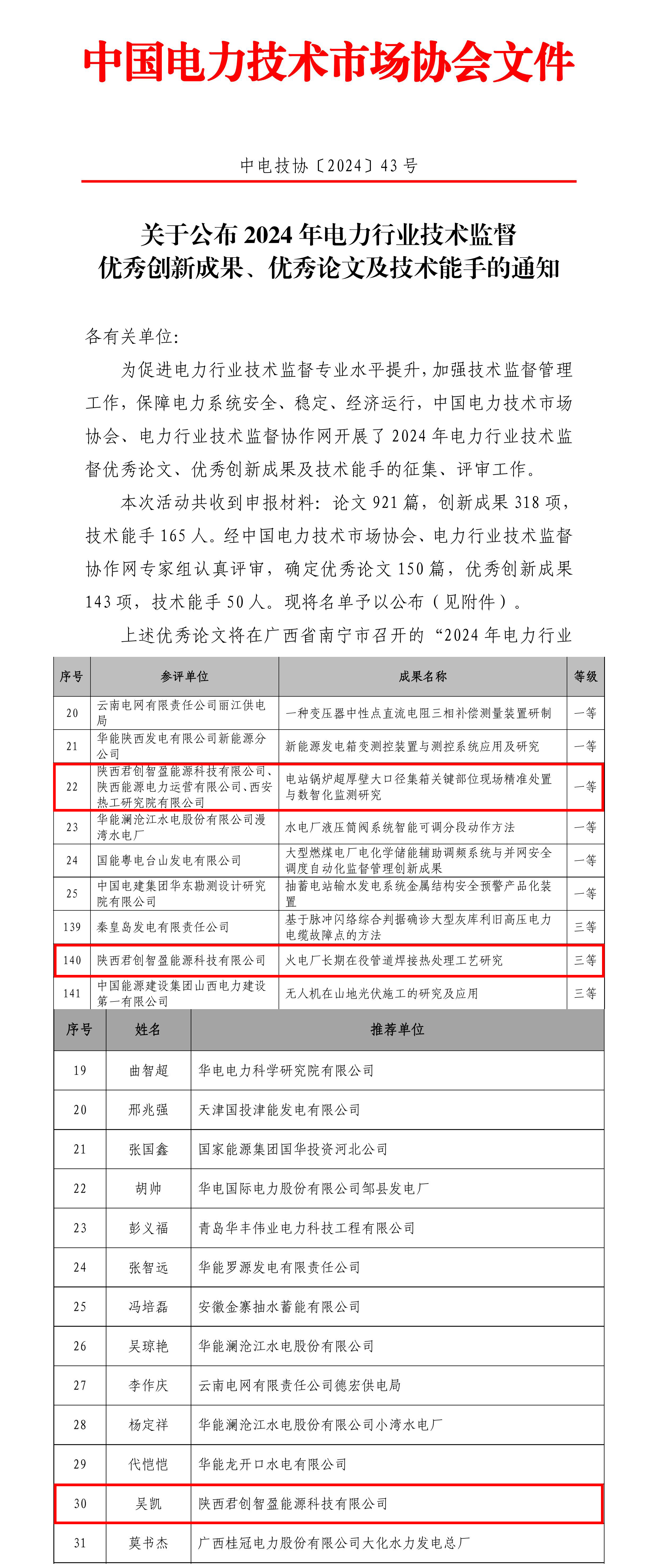 日前,君創科技《電站鍋爐超厚壁大口徑集箱關鍵部位現場精準處置與數智化監測研究》《火電廠長期在役管道焊接熱處理工藝研究》分獲中國電力技術市場協會2024年電力行業技術監督優秀創新成果一等獎、三等獎,吳凱獲技術能手稱號。