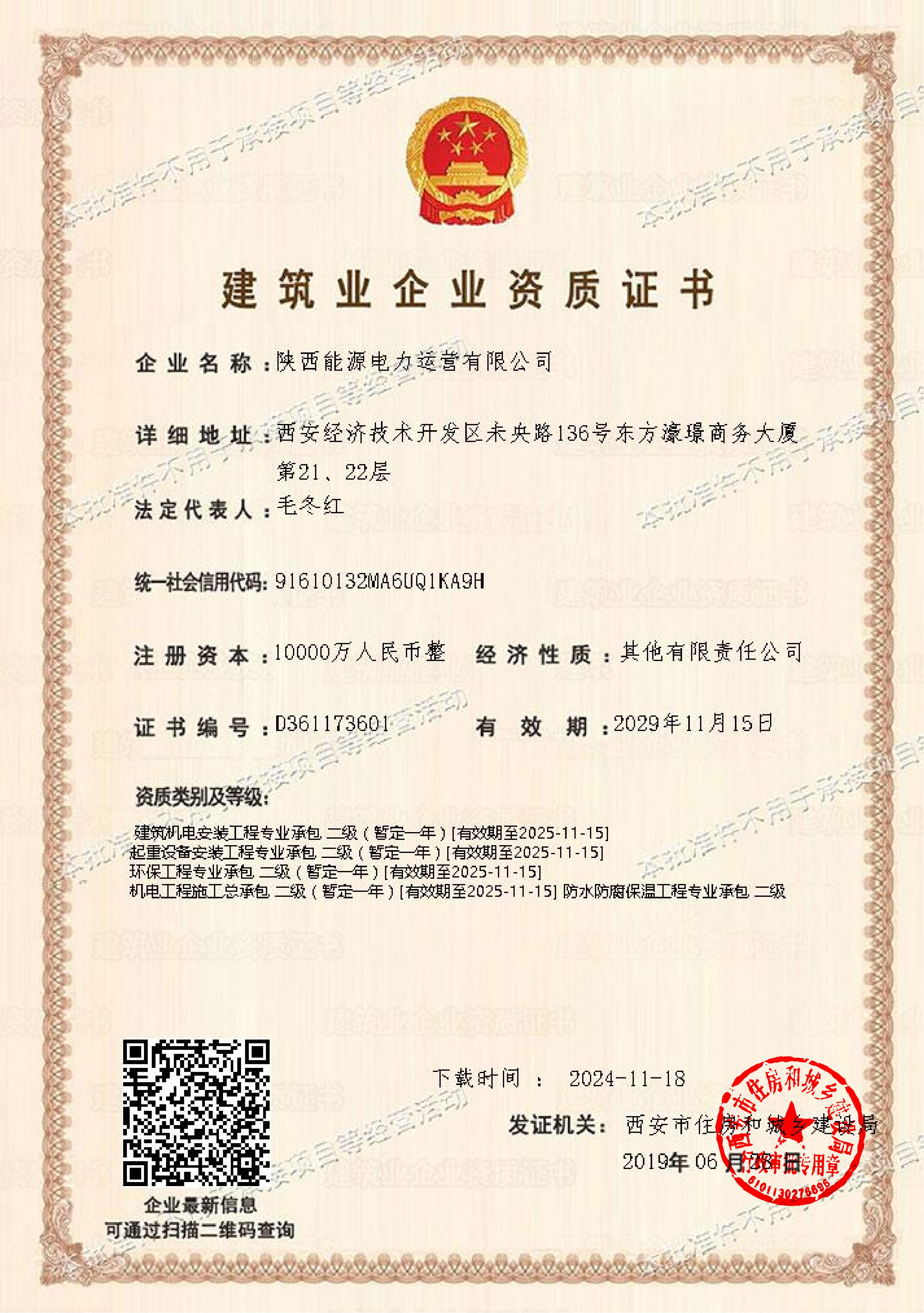 日前,經(jīng)陜西省住房和城鄉(xiāng)建設(shè)廳批準(zhǔn),公司順利通過“機(jī)電工程施工總承包”“建筑機(jī)電安裝工程專業(yè)承包”“起重設(shè)備安裝工程專業(yè)承包”等五項(xiàng)資質(zhì)的三級(jí)換二級(jí)續(xù)期換證。