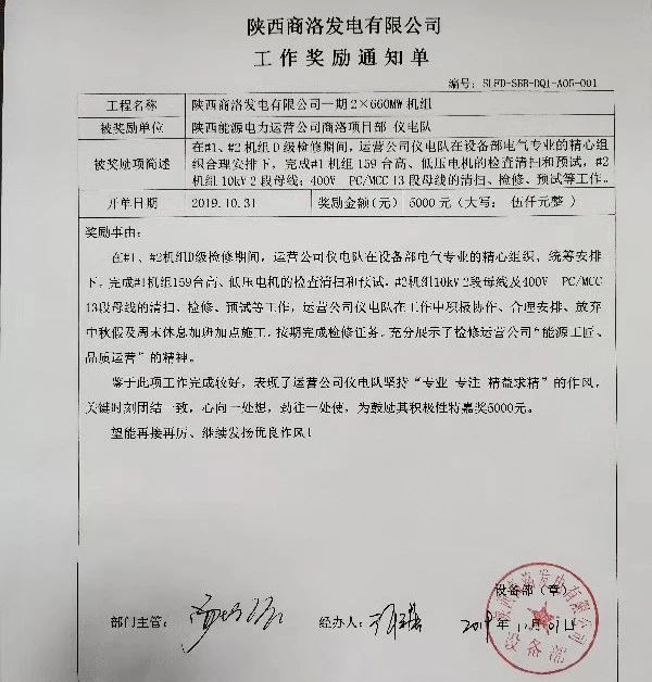 11月6日,商洛項(xiàng)目部收到商洛發(fā)電工作獎(jiǎng)勵(lì)5000元,以表彰儀電隊(duì)在近期加班加點(diǎn)完成#1機(jī)組159臺(tái)電機(jī),#2機(jī)組10kV2段母線修檢和預(yù)試等工作。這是今年以來(lái),項(xiàng)目部繼鍋爐班順利完工脫硫系統(tǒng)改造管道,獎(jiǎng)勵(lì)5000元;汽化水班如期完成#1機(jī)組主汽閥、調(diào)閥解體,獎(jiǎng)勵(lì)3000元;鍋爐班副班長(zhǎng)李海峰發(fā)現(xiàn)#2爐螺旋水冷壁泄露重大缺陷,獎(jiǎng)勵(lì)個(gè)人2000元后,收到的第四筆業(yè)主方工作獎(jiǎng)勵(lì)。