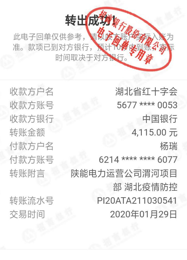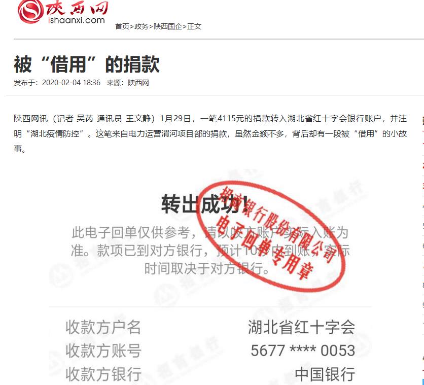 1月29日,一筆4115元的捐款轉入湖北省紅十字會銀行賬戶,并注明“湖北疫情防控”。這筆來自電力運營渭河項目部的捐款,雖然金額不多,背后卻有一段被“借用”的小故事。