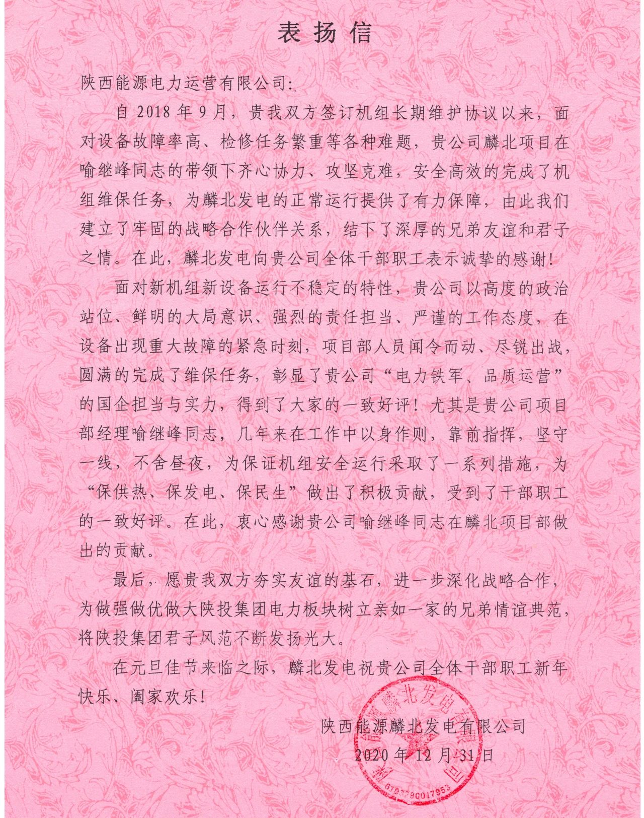 收到感謝信后,公司上下深受鼓舞,認為這封表揚信既是業(yè)主方對公司既往工作的肯定,又是對項目部員工堅守一線默默奉獻的褒獎!在今后的工作中,公司將進一步加強與麟北發(fā)電的戰(zhàn)略合作,優(yōu)質高效完成各項檢修維保任務,為做強做優(yōu)做大集團電力板塊、樹立親如一家的兄弟情誼典范做出不懈努力。
