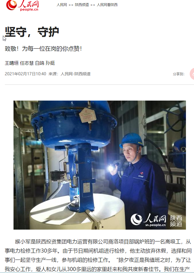 李海峰是陜西投資集團電力運營有限公司清水川項目部員工。從2月6日以來,項目部全體人員一直奮戰在生產一線,24小時兩班倒全程參與業主方機組的消缺工作?!俺χ?,在檢修現場吃完一頓簡單而特殊的年夜飯后,我和我的同事們又馬不停蹄,全力投入搶修工作,為確保除夕夜萬家燈火的溫馨,默默奉獻著自已的力量。” 李海峰說。